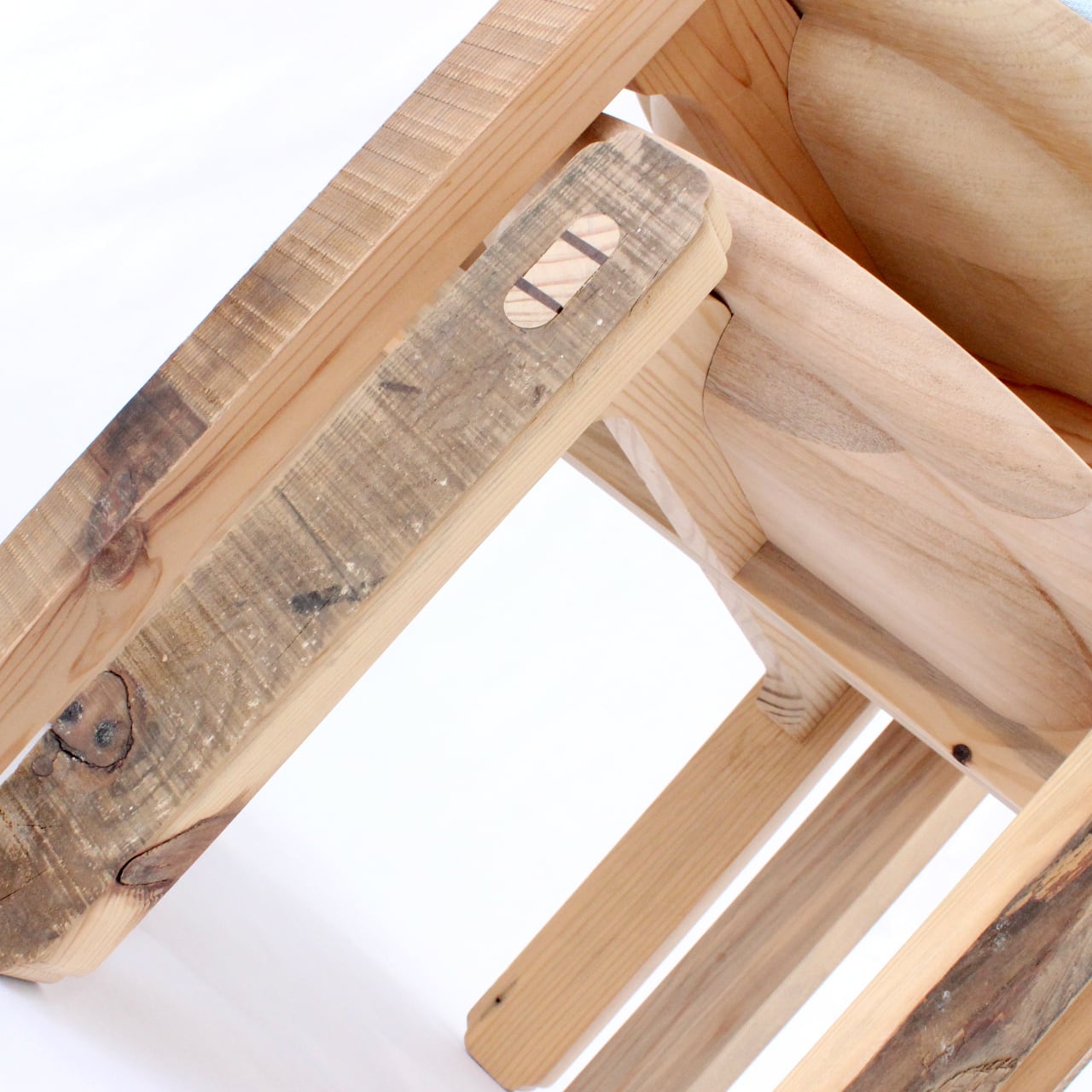 このスツールは能登半島地震で倒壊した家屋の災害廃材を活用し、